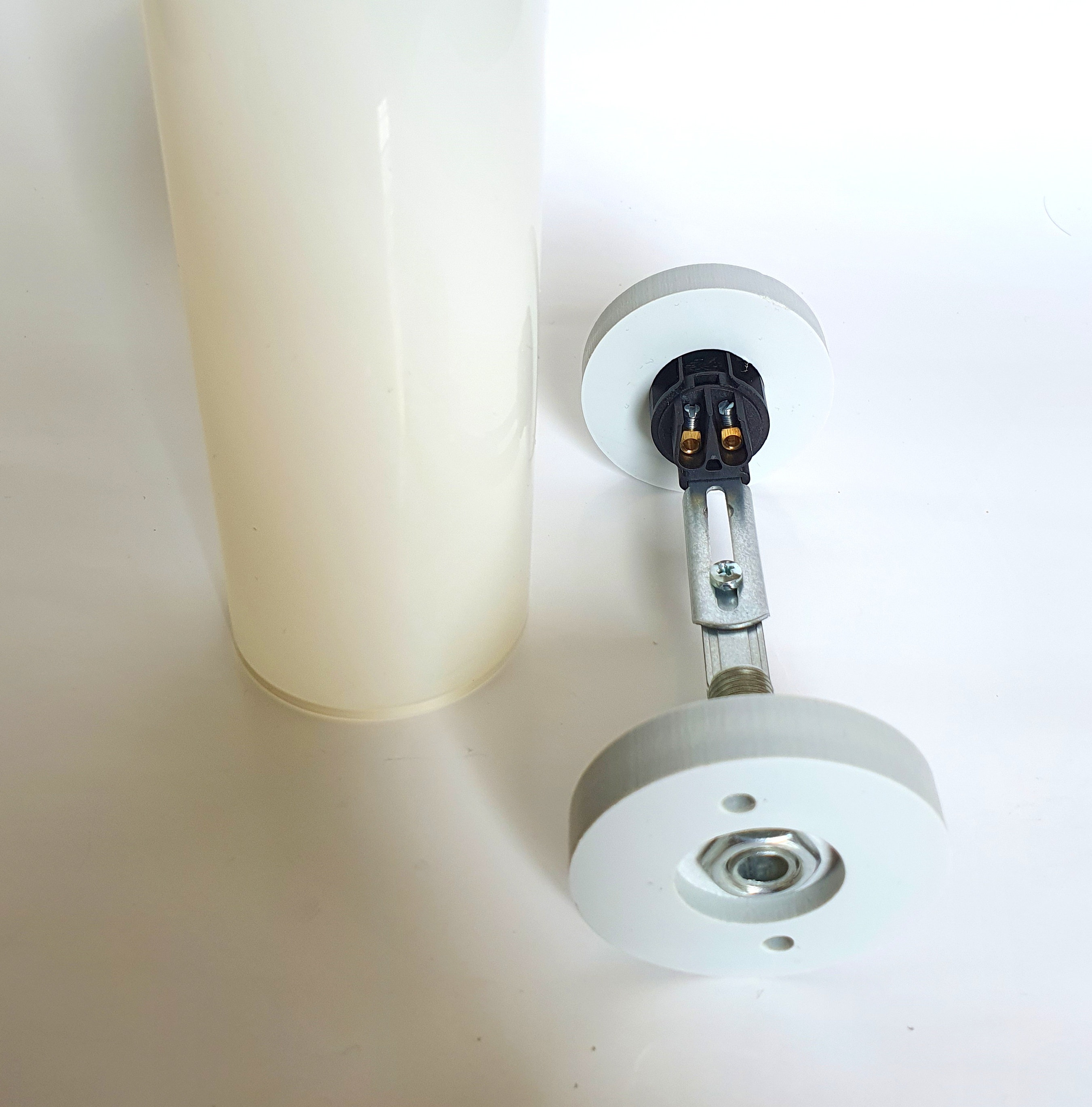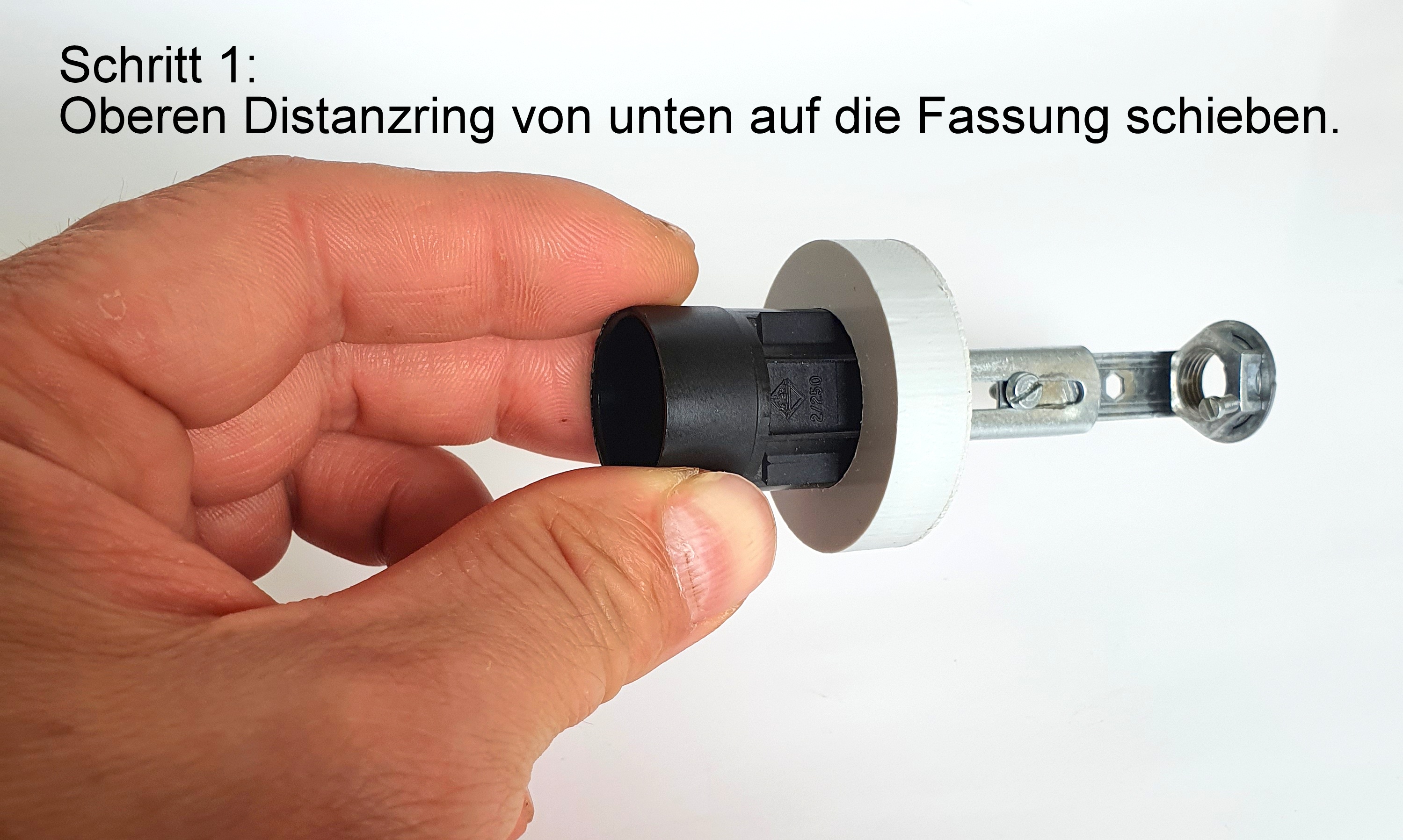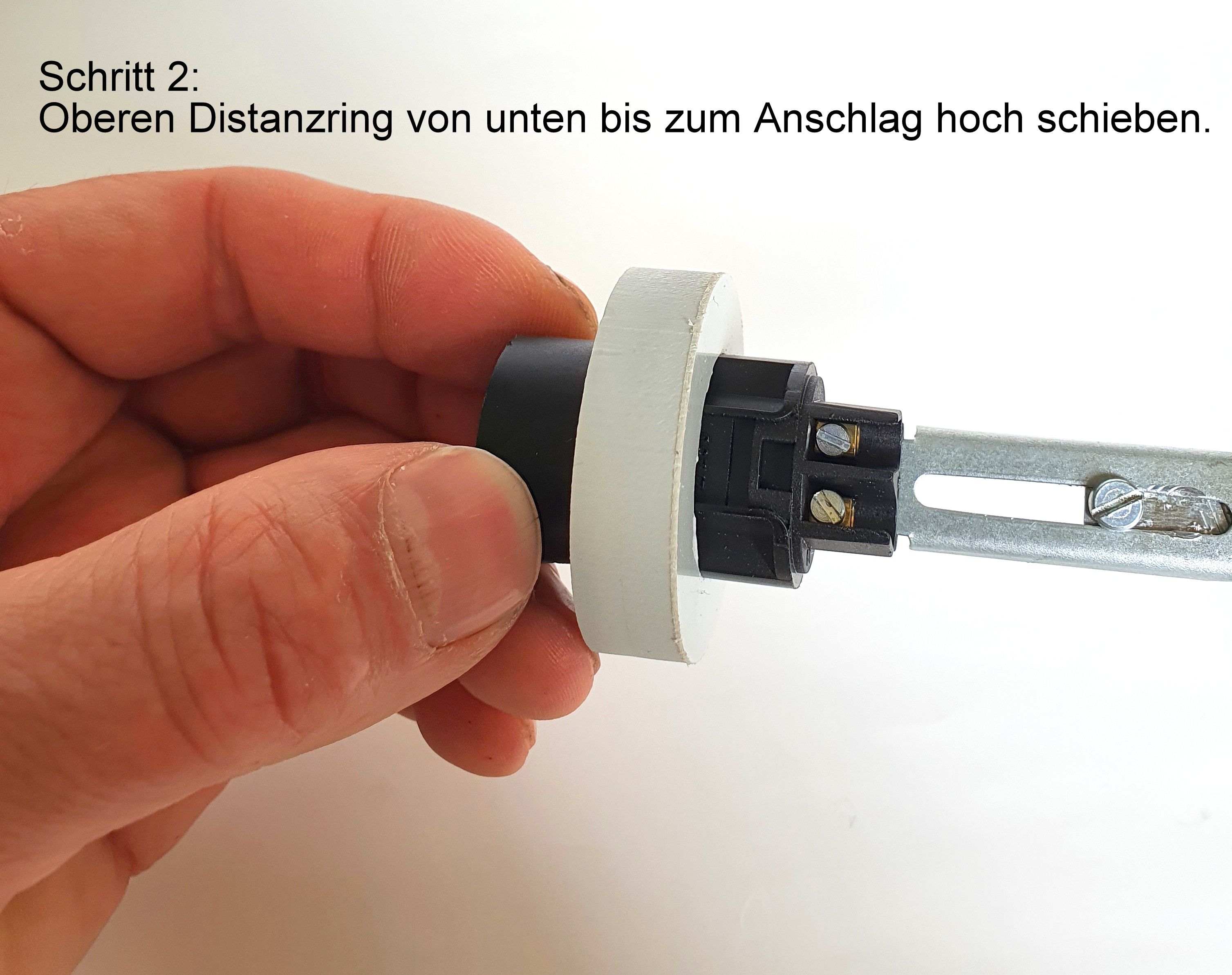 • 2 Kunststoffringe Stärke 10mm, Ø ca. 39mm als Distanzhalterung zwischen Fassung und Glaskolben, unterer Ring mit Bohrungen zur Befestigung nach unten