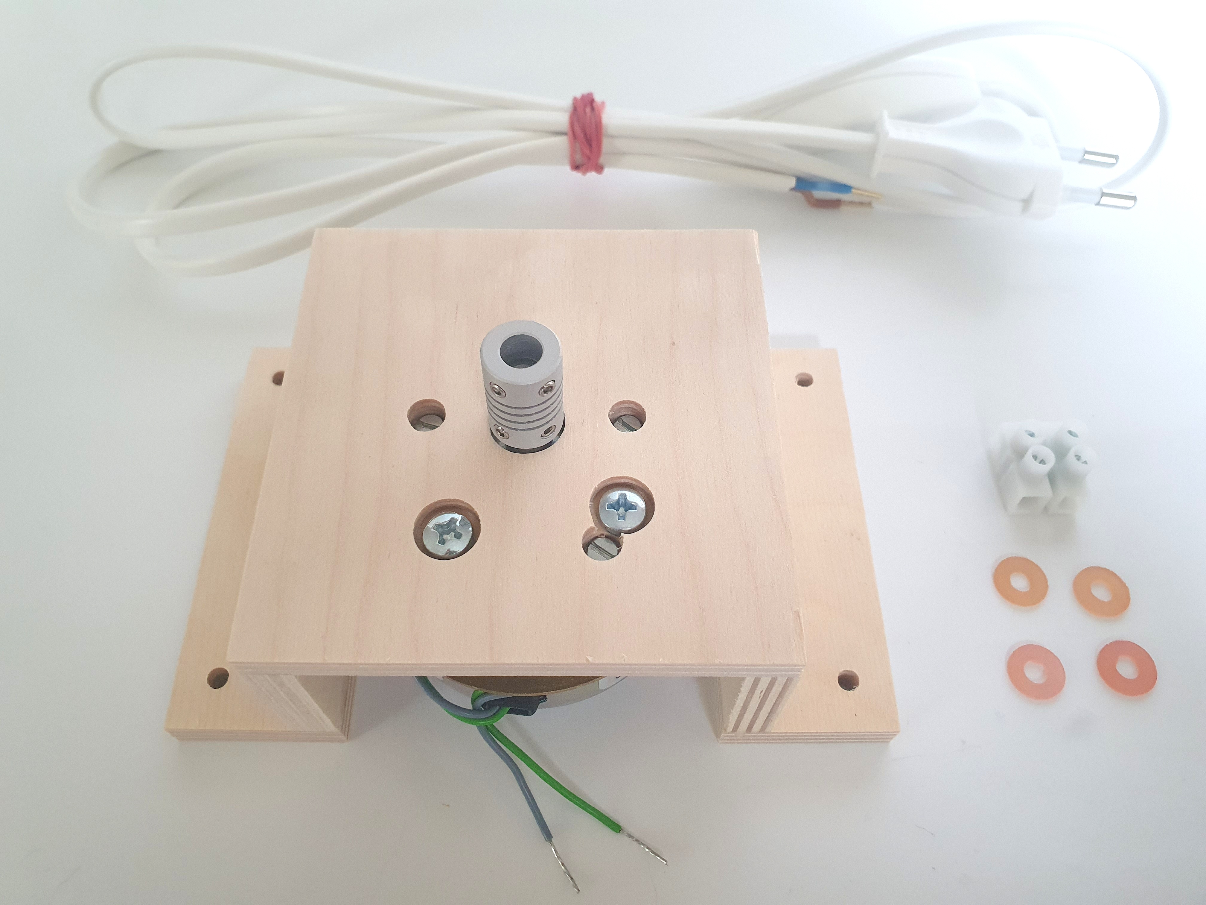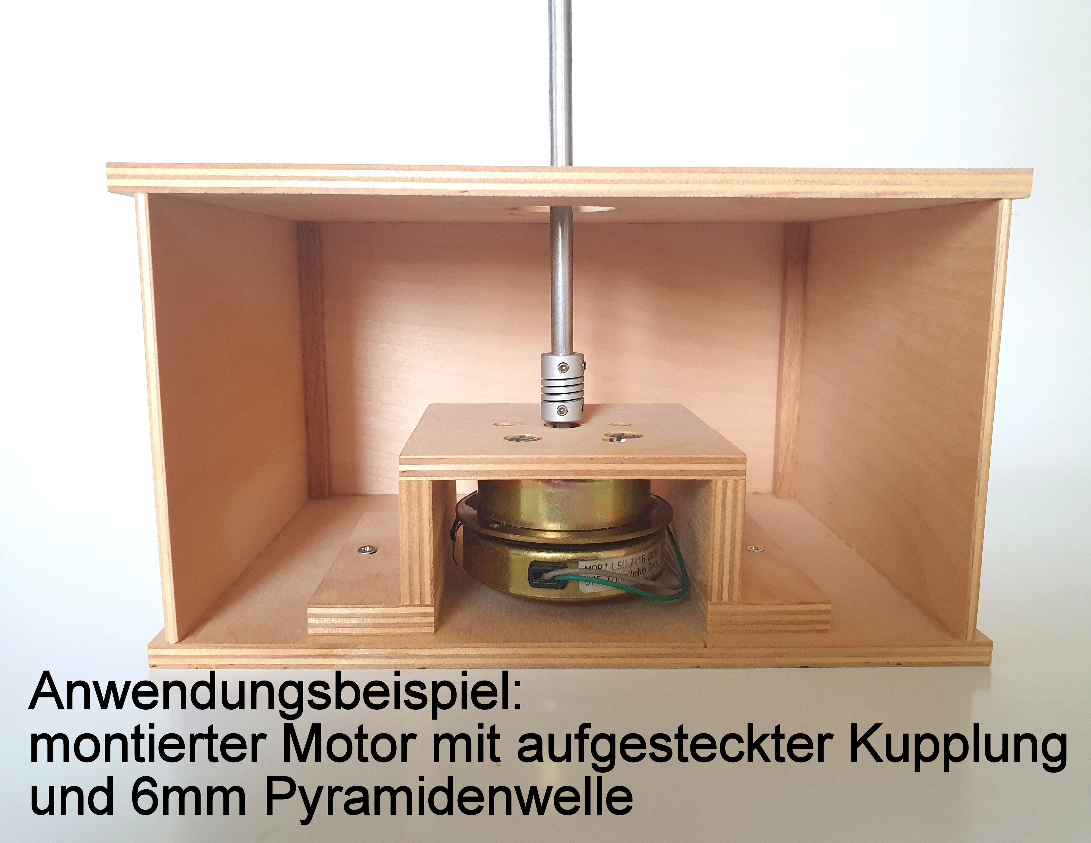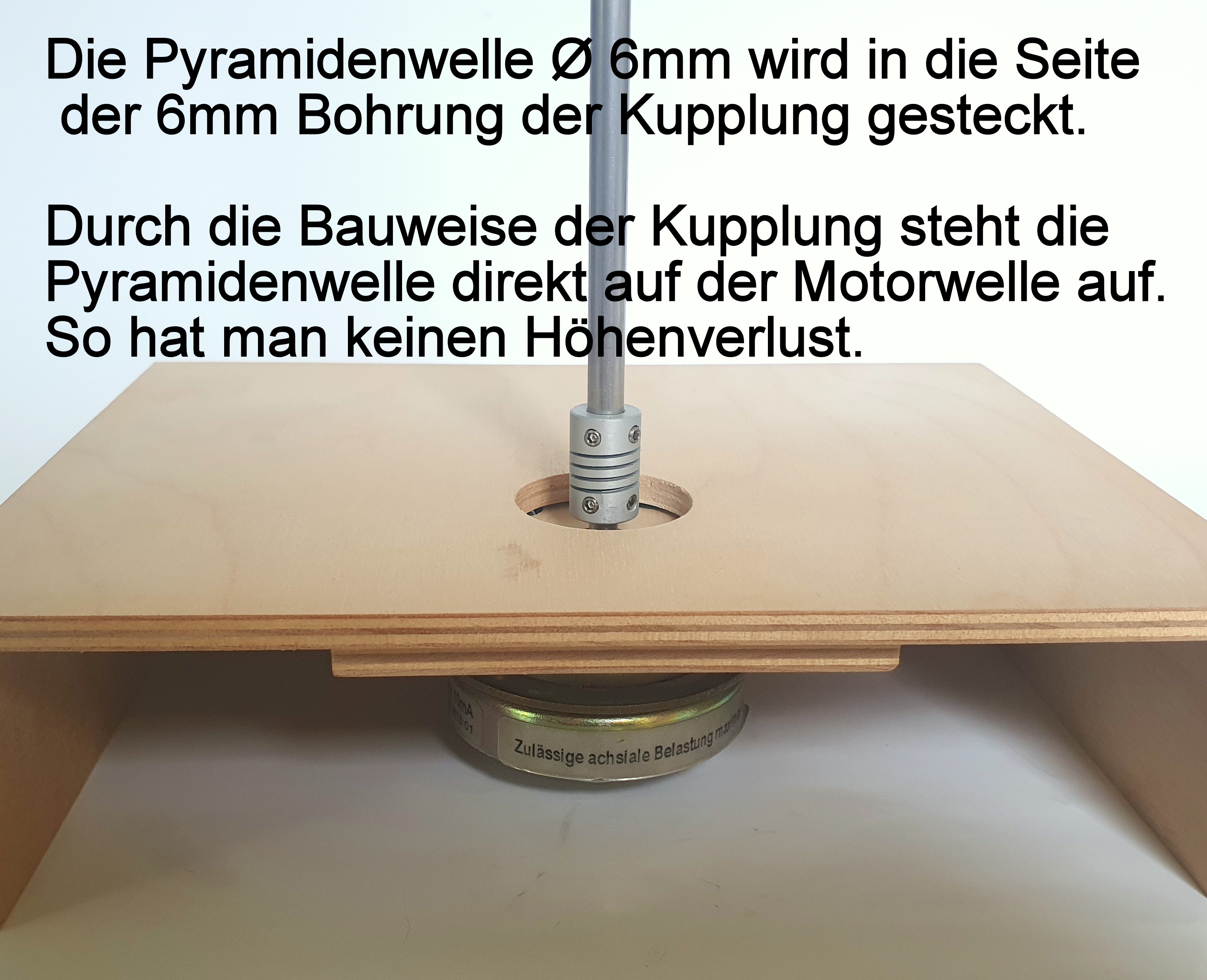 Hier haben wir für Sie alle wichtigen Teile zu einem Set zusammen gestellt, die Sie zum Einbau eines Pyramidenmotors benötigen, wenn Sie den Motor auf dem unteren Pyramidenboden (siehe Fotos) befestigen möchten. Alle diese im Set enthaltenen Artikel sind auch als Einzelartikel erhältlich und mit den entsprechenden Artikelnummern ausgewiesen. Dieses Set erhalten Sie vormontiert. Nur die Kabel müssen noch verbunden und die Kupplung muss aufgesteckt werden. Die Gesamthöhe des Motors inkl. Kupplung ist 62mm. Je nach Pyramidenbauart kann es möglich sein, dass zwischen Grundplatte und Pyramidenboden noch ein Höhenausgleich gemacht werden muss, z.B. durch Zwischenlegen kleiner Sperrholzplatten oder Ähnlichem.