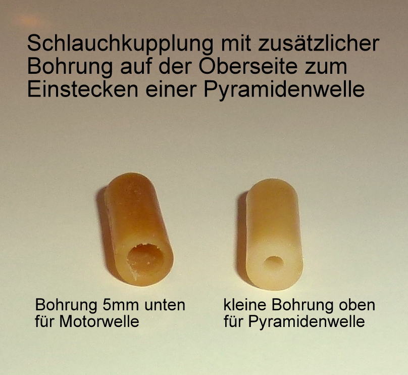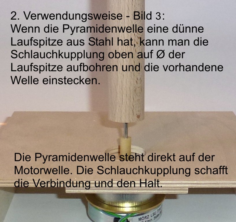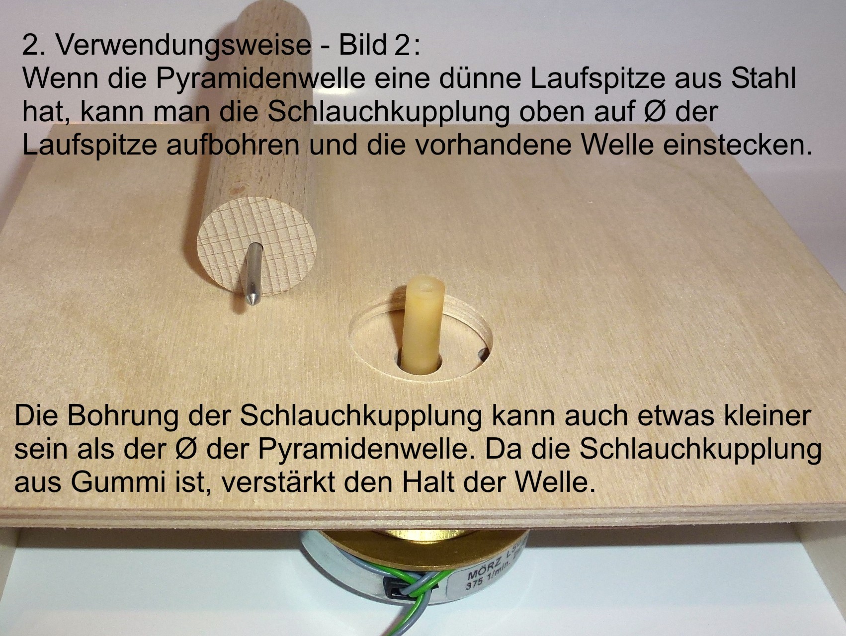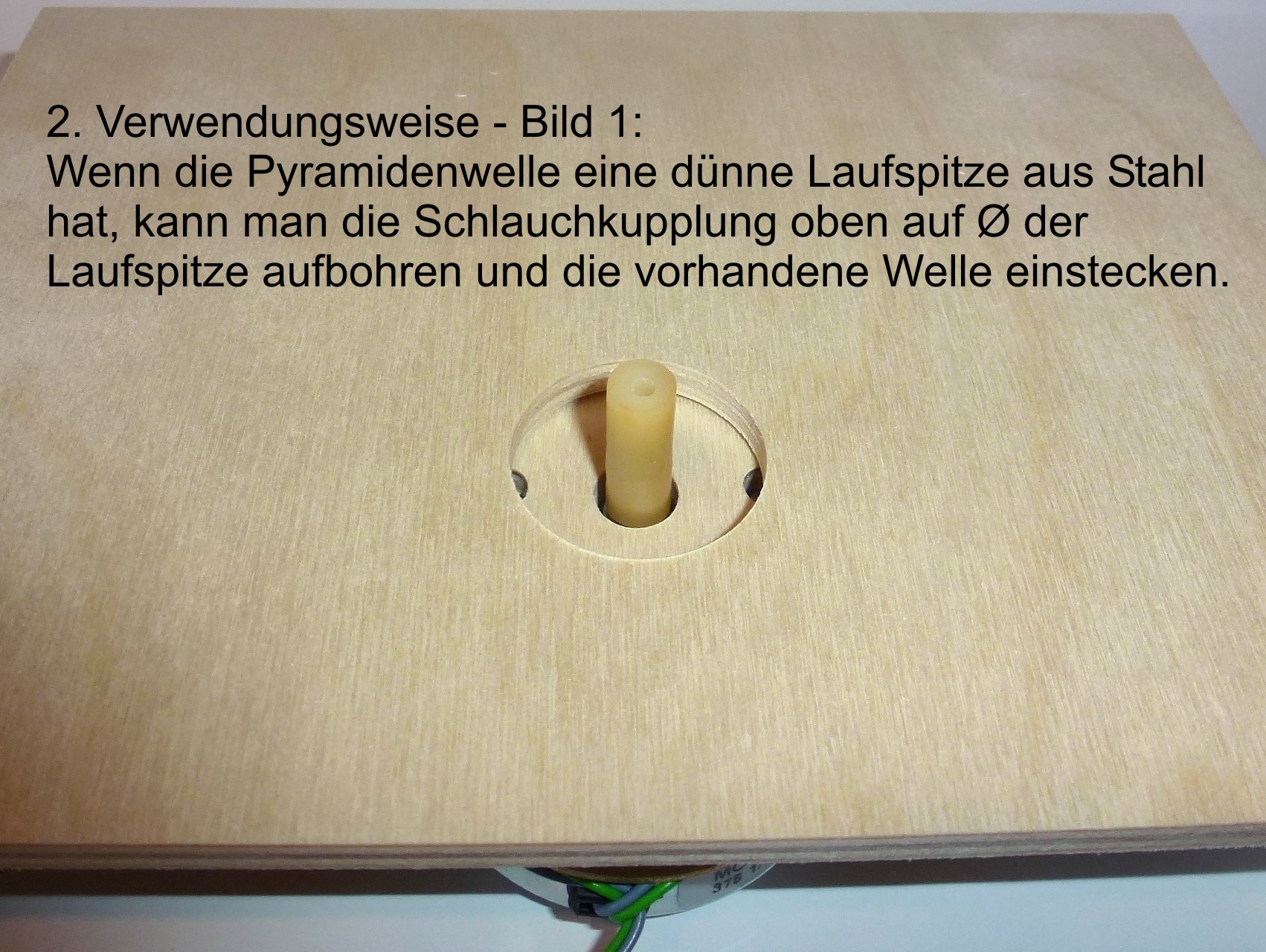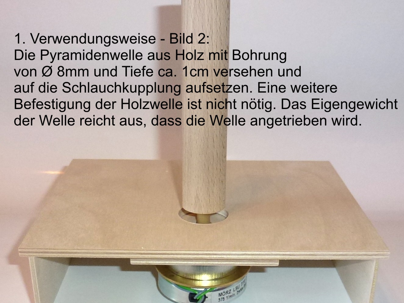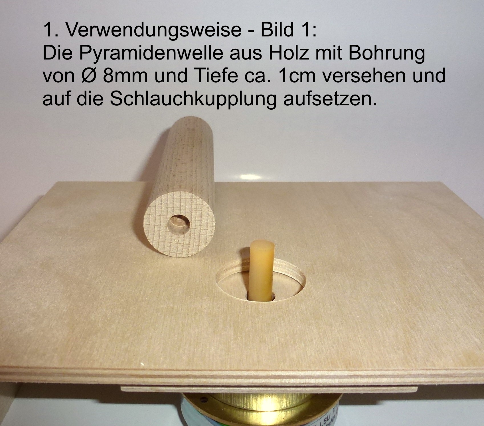 1. Verwendungsweise Kupplung Oberseite geschlossen: die Pyramidenwelle aus Holz mit Bohrung von Ø 8mm versehen und auf die Schlauchkupplung Aufsetzen