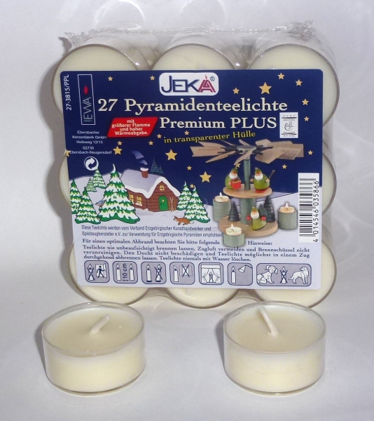 - speziell für Pyramiden entwickeltes Teelicht mit größerer Flamme und hoher Wärmeabgabe für ein leichteres Drehen der Pyramide